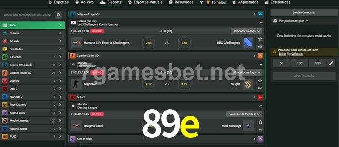 O 89e oferece uma grande seleção de opções de apostas em e-sports com probabilidades competitivas